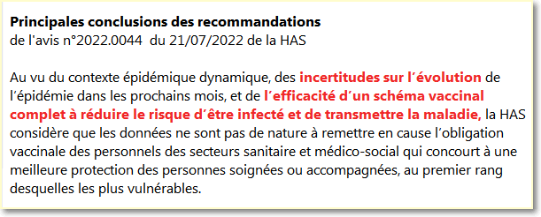 La vaccination débutée, symboliquement, le 27 décembre 2020, ne fut, effectivement, déployée qu'au début de l'année 2021 n'a pas empêché le développement de nouvelles vagues en 2022. Nouvelles vagues caractérisées par l'apparition de nouveaux sous-variants, démontrant ainsi que la vaccination n'a pas ou que peu d'effet sur la limitation de la propagation ou la réduction des contaminations des variants du virus ainsi qu'il en ressort de l'avis de la HAS du 21 juil. 2022 relatif à l’obligation de vaccination contre la Covid-19.